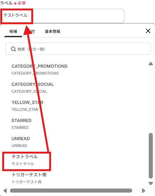 メールを検出するラベルを指定します。Gmailの受信ボックスでラベル分けをしている場合は、「候補」より任意のラベルを選びましょう。