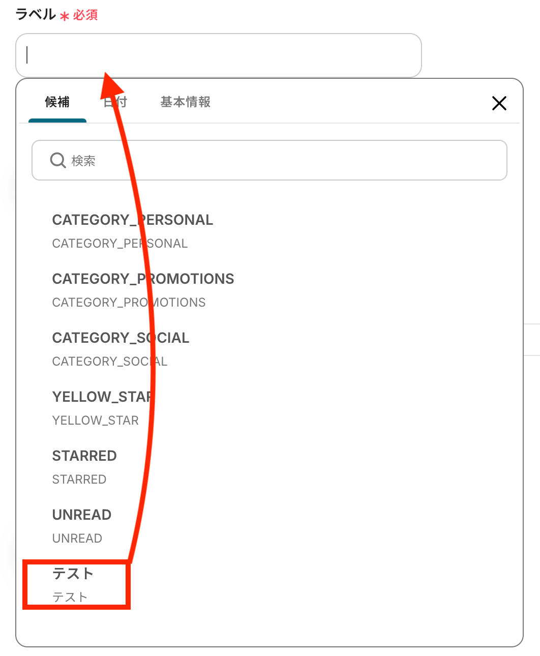 ラベル:クリックするとプルダウンが出てくるので、Gmailにある既存のラベルを選びましょう。