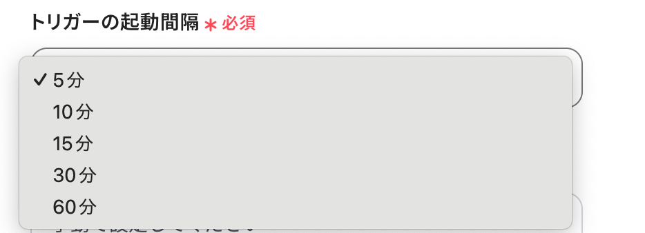 - トリガーの起動タイミングは、5分、10分、15分、30分、60分のいずれかで設定できます。