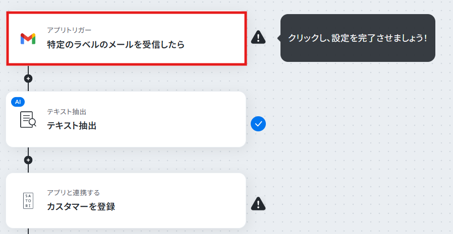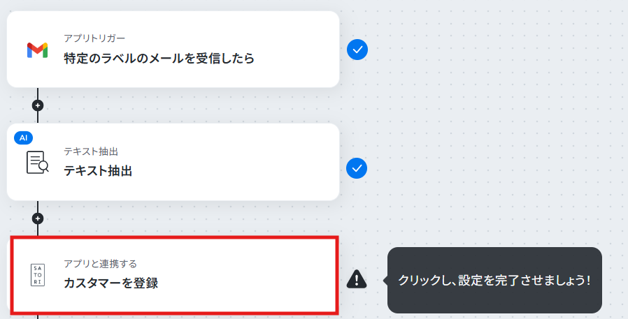 ステップ5:SATORIのアクション設定 次に、Gmailから抽出したテキスト情報をもとに、SATORIにカスタマーを登録する設定を行います。 「カスタマーを登録」をクリックしてください。