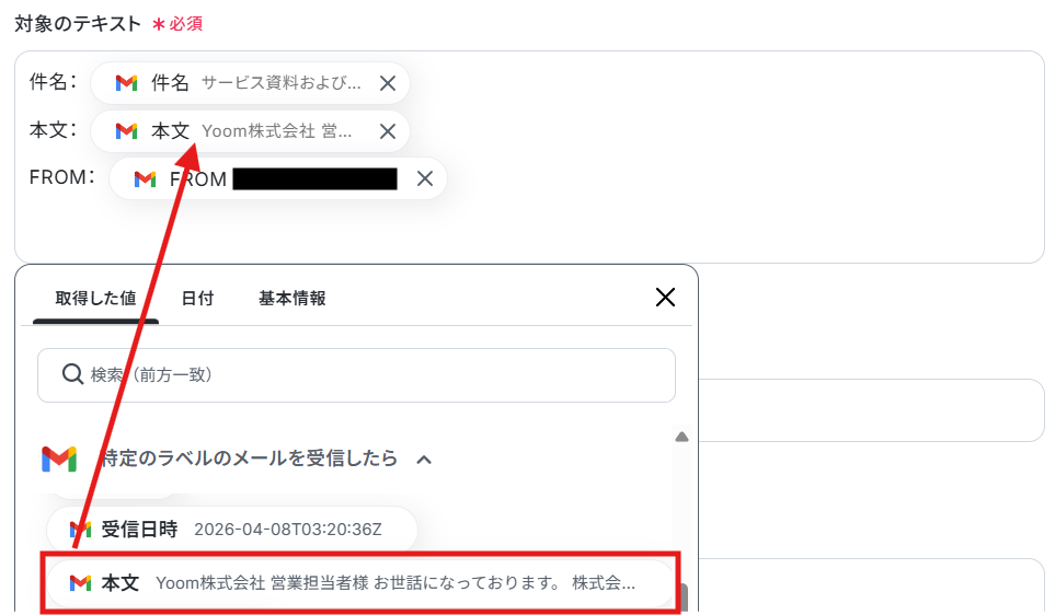 抽出対象のテキストは、テンプレートであらかじめ設定されています。 もし変更したい場合は、編集欄をクリックして「特定のラベルのメールを受信したら」から、Gmailに送信したテストメールの内容を引用できます。 必要に応じて設定を調整しましょう。