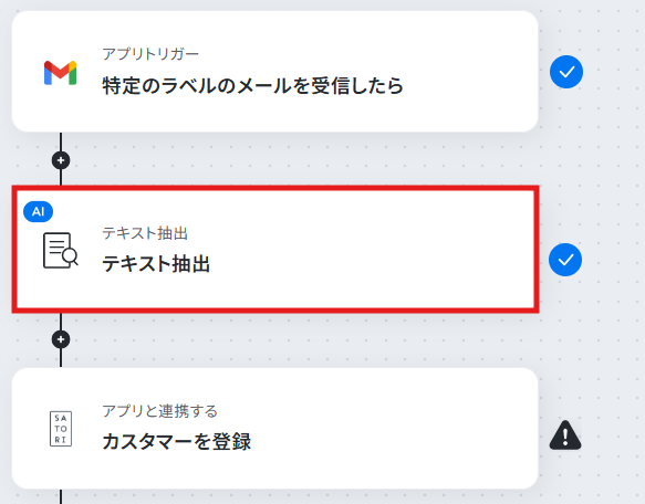 ステップ4:テキストの抽出設定 次に、Gmailに送信したテストメールからSATORIに連携する情報を抽出する設定を行います。 「テキスト抽出」をクリックしてください。
