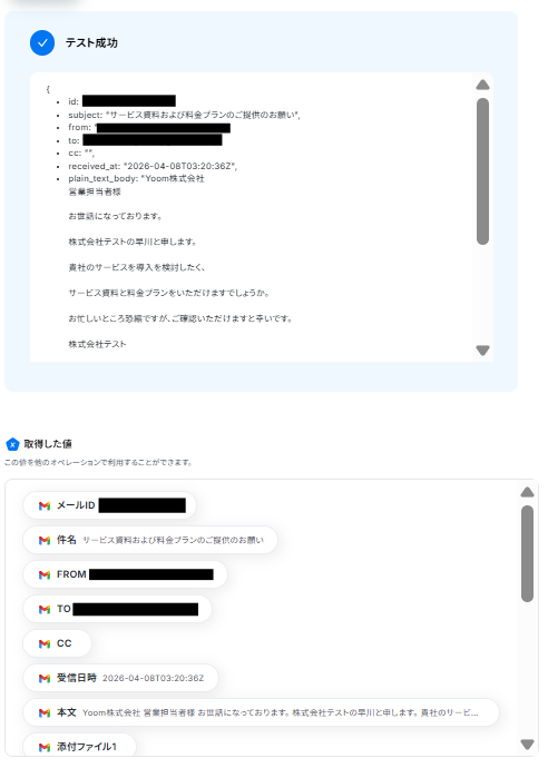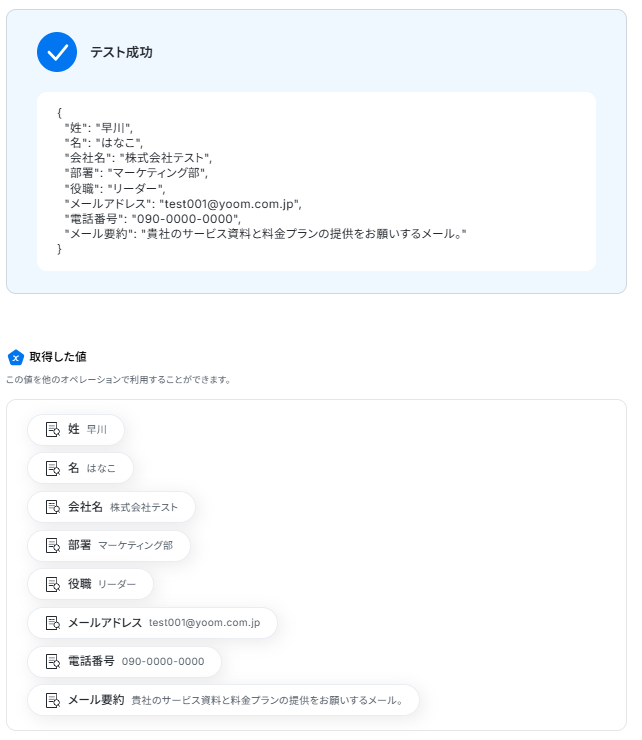 その後Yoomの操作画面に戻り「テスト」をクリックしてください。 テストが成功すると、先ほどGmailに送信したテストメールの詳細情報が表示されます。 「完了」をクリックして設定完了です!