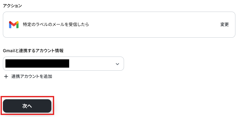 クリックすると以下の画面に移ります。 アカウント情報と書かれた項目にはステップ1でマイアプリ連携した際の情報が記載されています。 トリガーアクションは、「特定のラベルのメールを受信したら」のままで次に進みましょう!