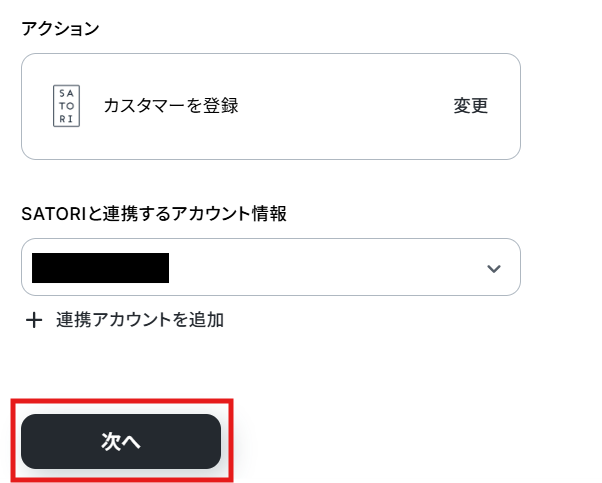 クリックすると以下の画面に移ります。 Gmailと同様に、ステップ1でマイアプリ連携したSATORIのアカウント情報が自動で表示されます。 アクションは、「カスタマーを登録」のままで次に進みましょう!