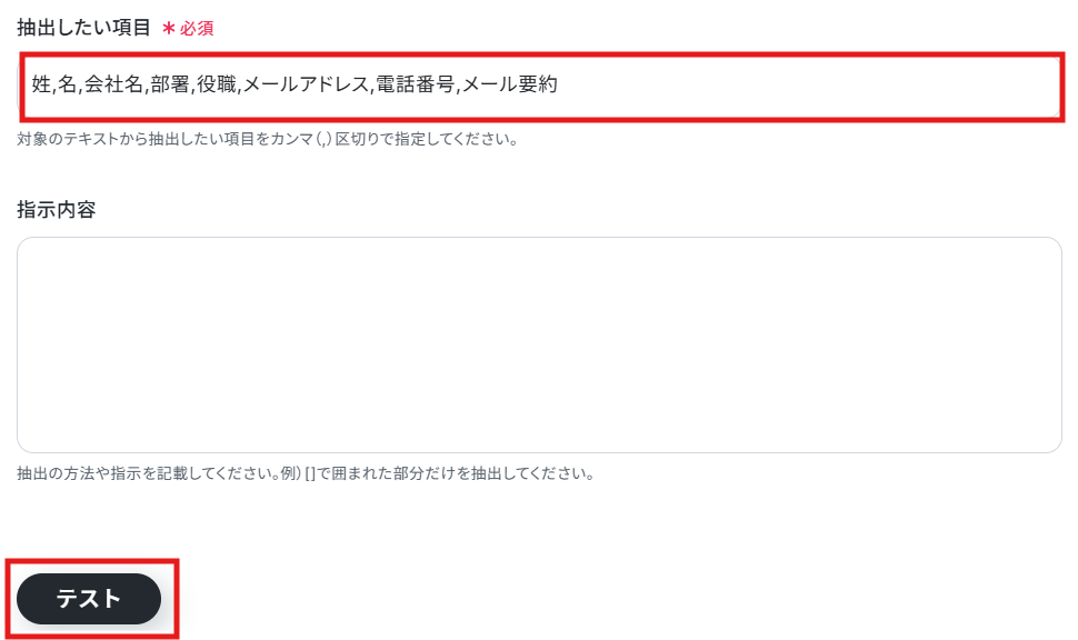 以下を参考に、「抽出したい項目」を入力してください。 今回は簡単な抽出のため、「指示内容」は空欄のままで問題ありません。 ここまで設定できたら、テストを実行しましょう。