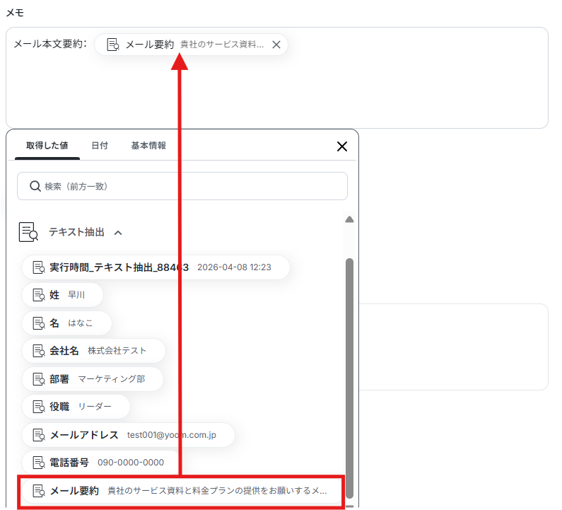 今回は、ステップ4で抽出した「メール要約」を連携する設定として、以下のように設定しました。 ぜひ参考にしてみてくださいね!