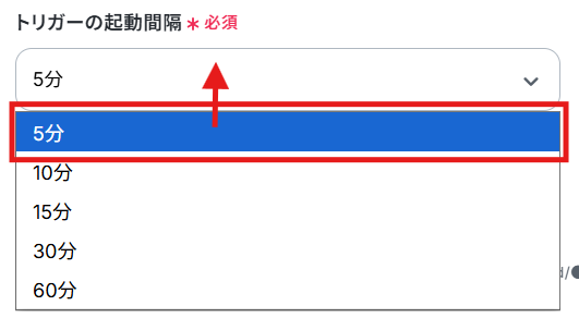 YoomがGmailの受信メールを確認する間隔を設定します。 編集欄をクリックし、5分、10分、15分、30分、60分から任意で選択してください。ご利用プラン により設定できる最短の間隔が異なるため、ご注意ください。 なお、基本的にはそのプランの最短の起動間隔にしてお使いいただくことをおすすめします。
