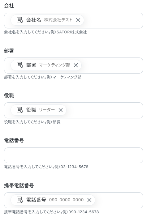 SATORIにカスタマー情報を登録するオペレーションで、Sansanの名刺情報から連携したい項目(会社名、氏名、メールアドレスなど)を任意で設定してください。