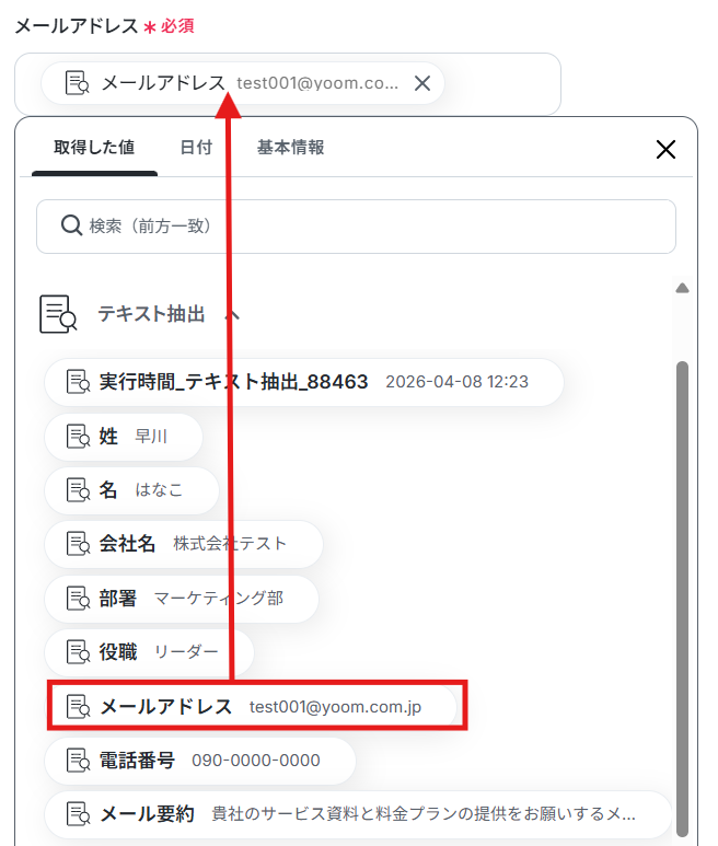 先ほど設定した「メールアドレス」同様に、連携したい項目に対応する値を「テキスト抽出」から選択してください。 連携する必要がない箇所は、空欄のままで問題ありません。
