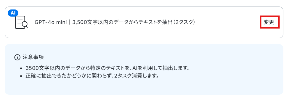 AIモデルや文字数を変更したい場合は、赤枠内の「変更」をクリックして変更が可能です。 なお、()内のタスクを消費しますので、使用プランやデータの容量を踏まえて選択してください。