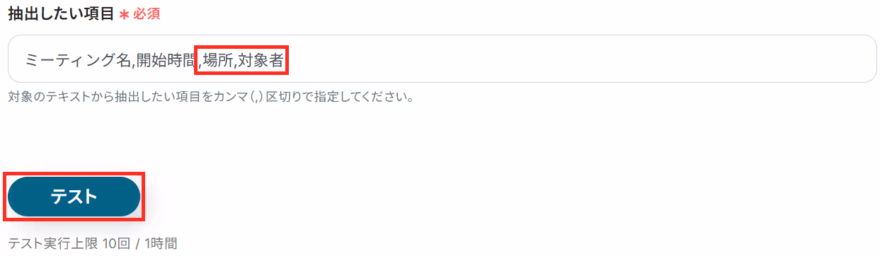 抽出したい項目も予め設定されていますが、編集・追加する場合は以下の赤枠のようにカンマ区切りで入力しましょう。