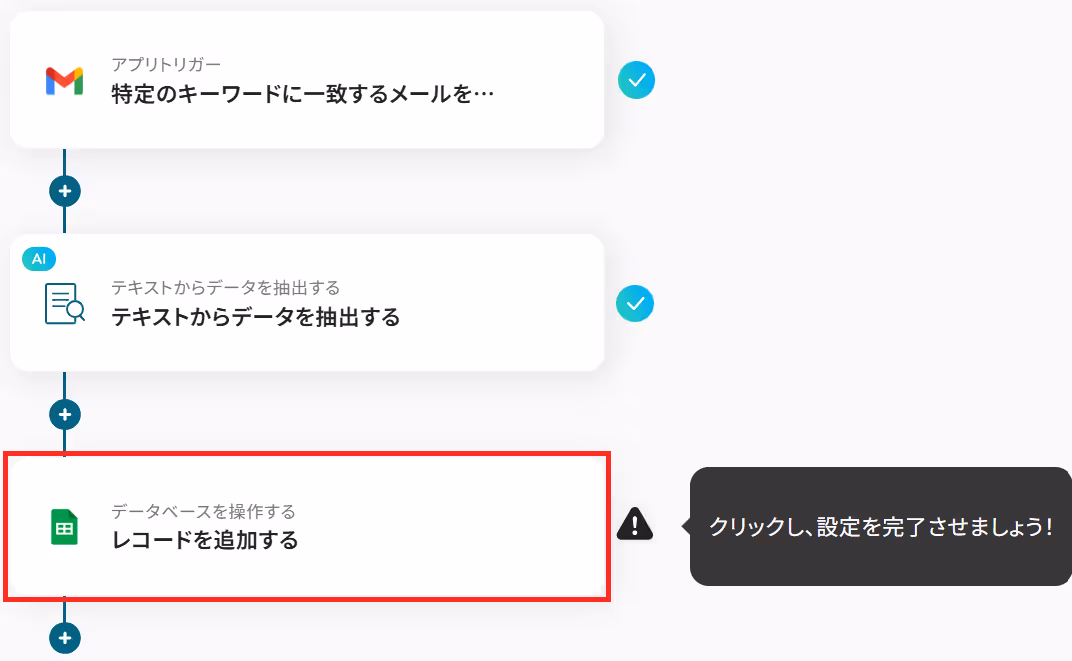 メール本文から必要な情報だけをAIで抽出する処理を組み合わせるため、より整理されたデータベースを自動で構築することが可能です。
