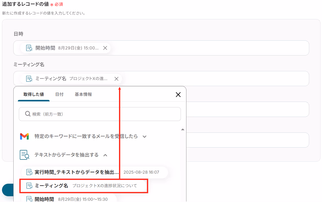 以下のようにステップ4で取得したアウトプットを選択すると、ミーティング情報を変数として反映させることができます。