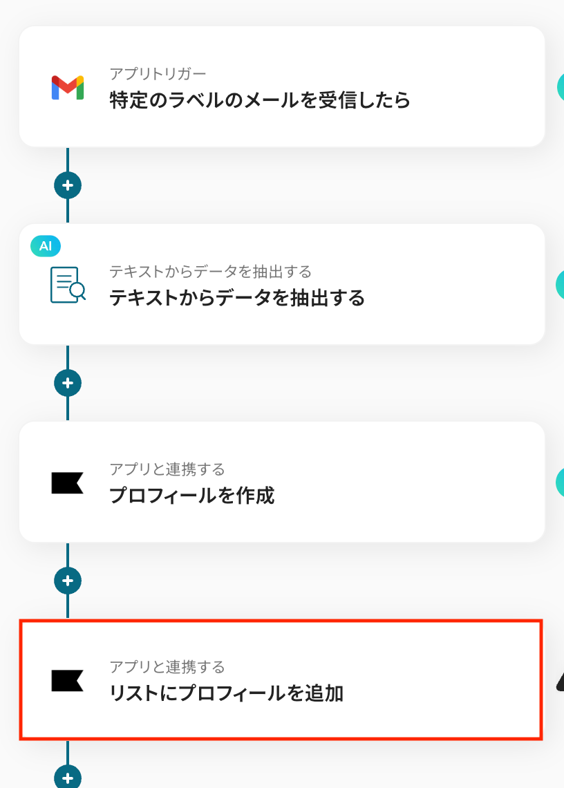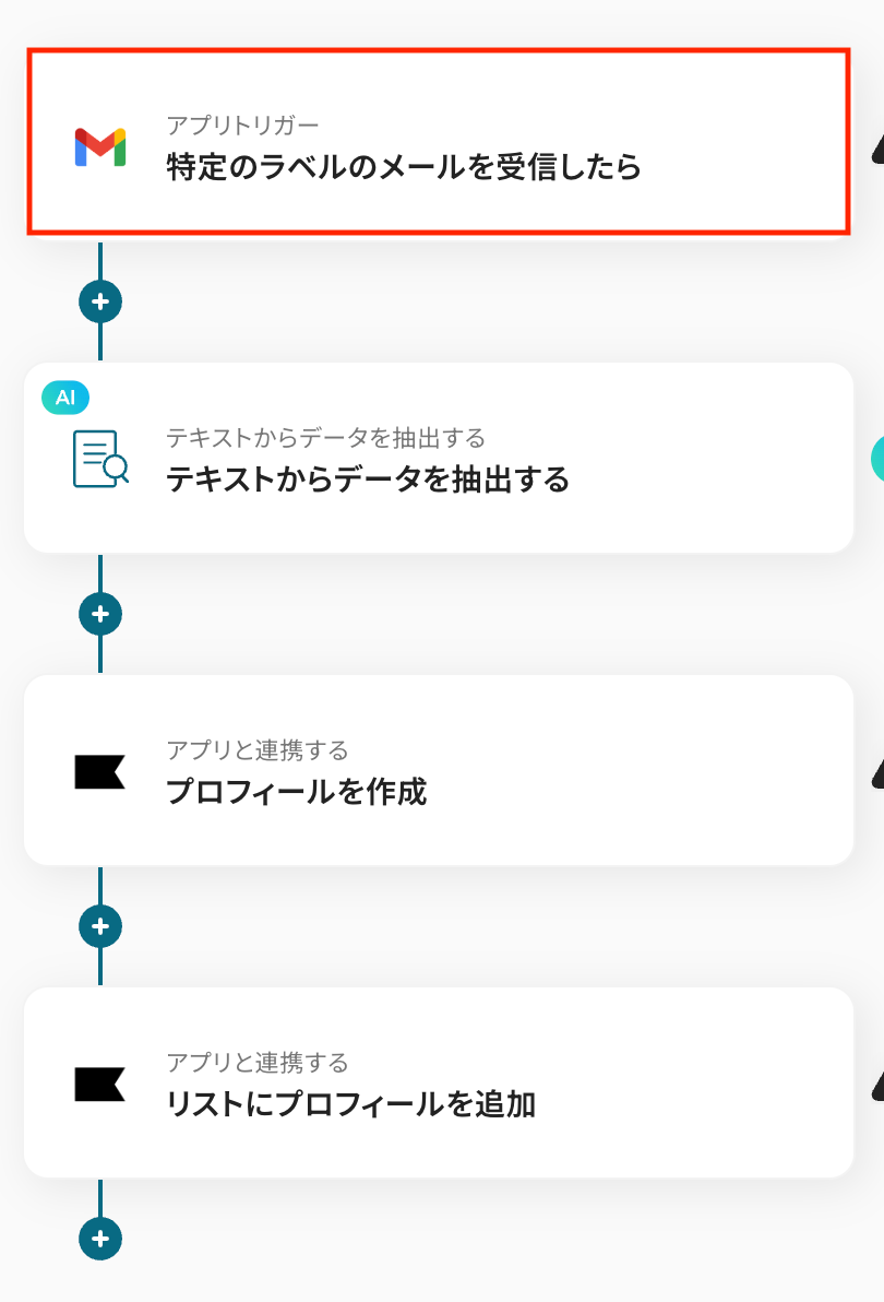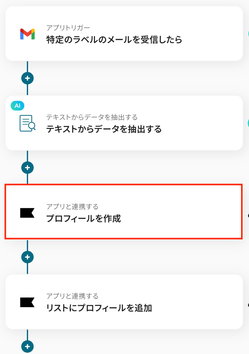 たとえばトリガーとなるメール本文に「新規」などのキーワードが含まれる場合のみプロフィール作成処理を進める、といった条件分岐も可能です。