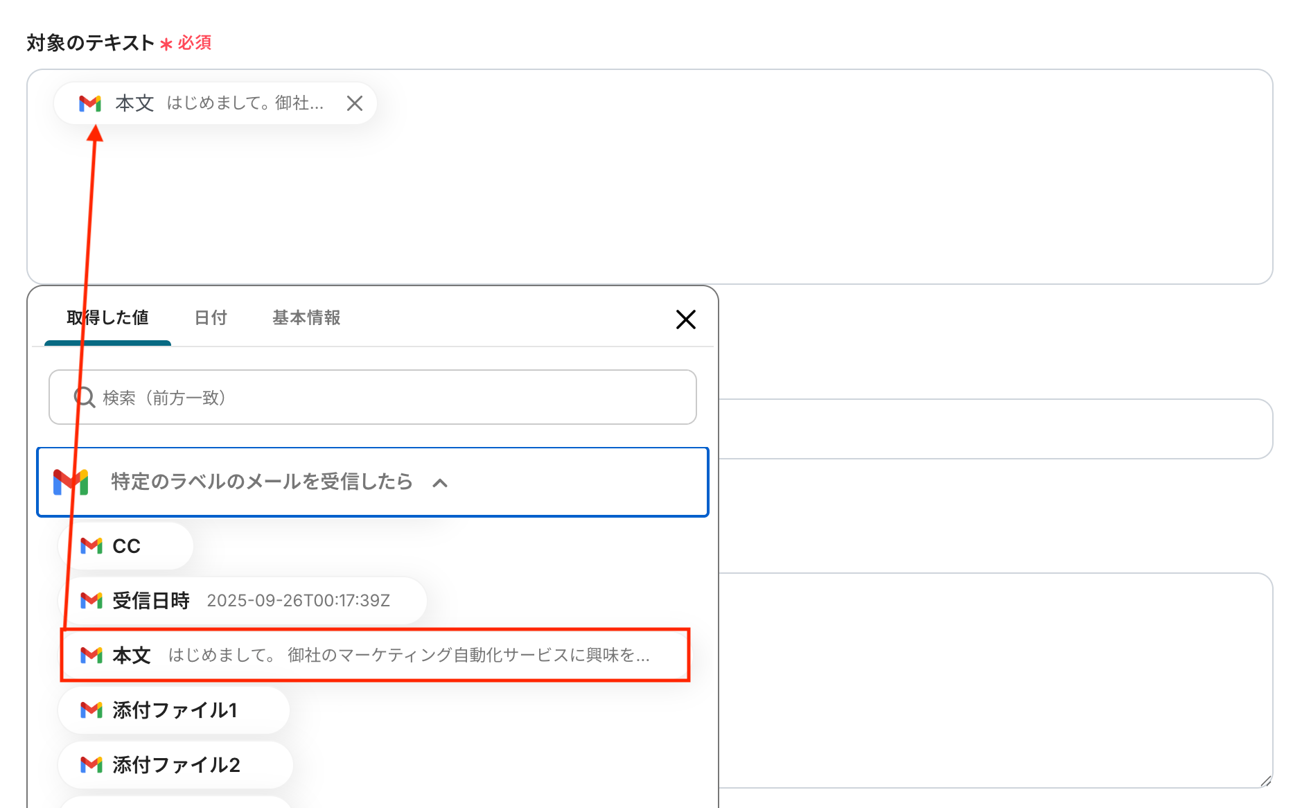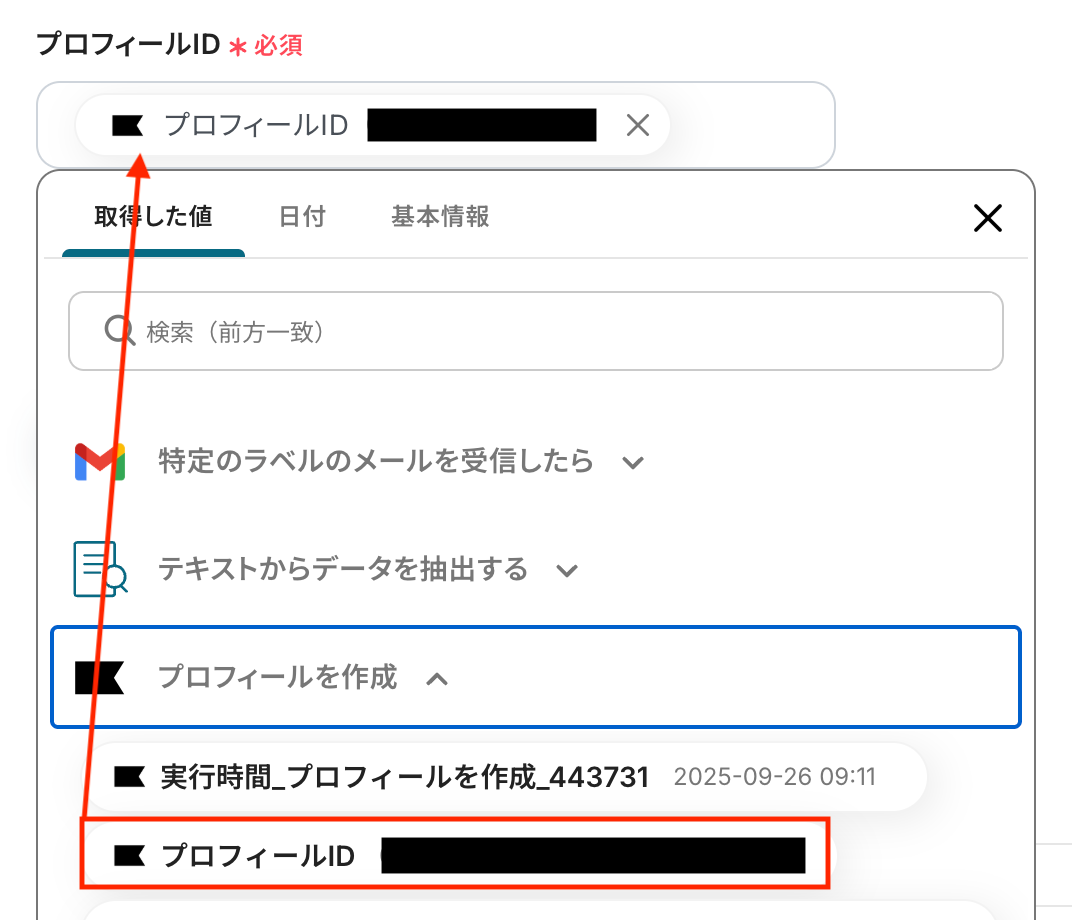 入力欄をクリックすると、前のステップでGmailから取得した値が表示されるので、選択して入力しましょう。