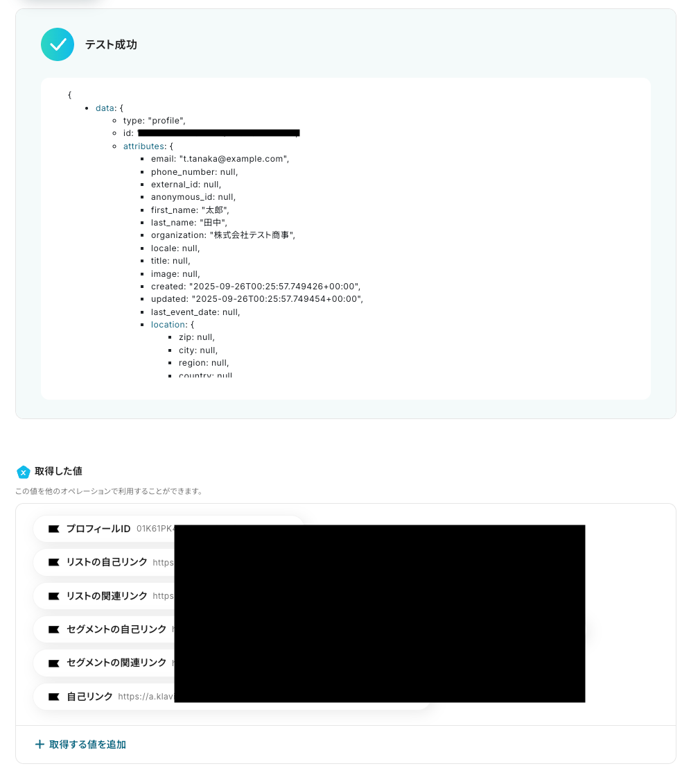 なお、テキストを直接入力した部分は固定値とされるため、取得した値を活用せず設定を行うと毎回同じデータがKlaviyoに登録されてしまうので注意が必要です。