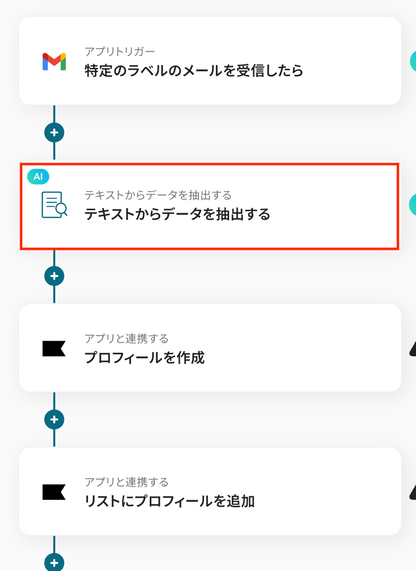 Gmailのトリガーイベントとして取得したメール内容を対象に、AIで特定のテキストを抽出します。