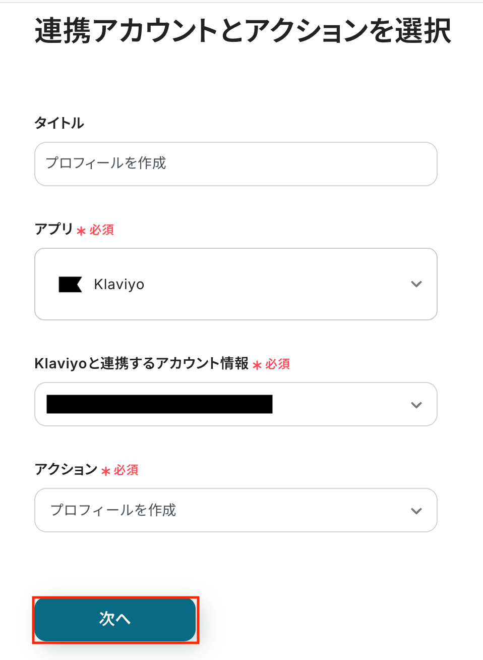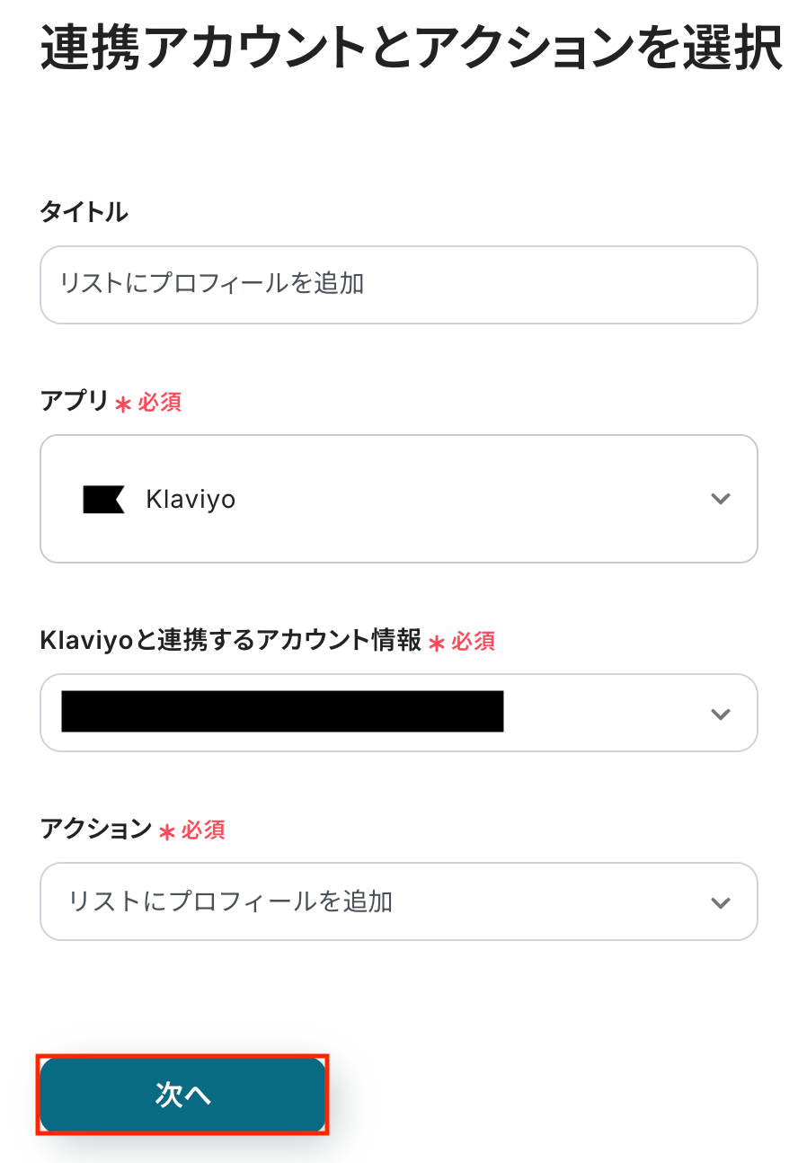 Klaviyoと連携するアカウント情報に問題がなければ、「次へ」をクリックします。