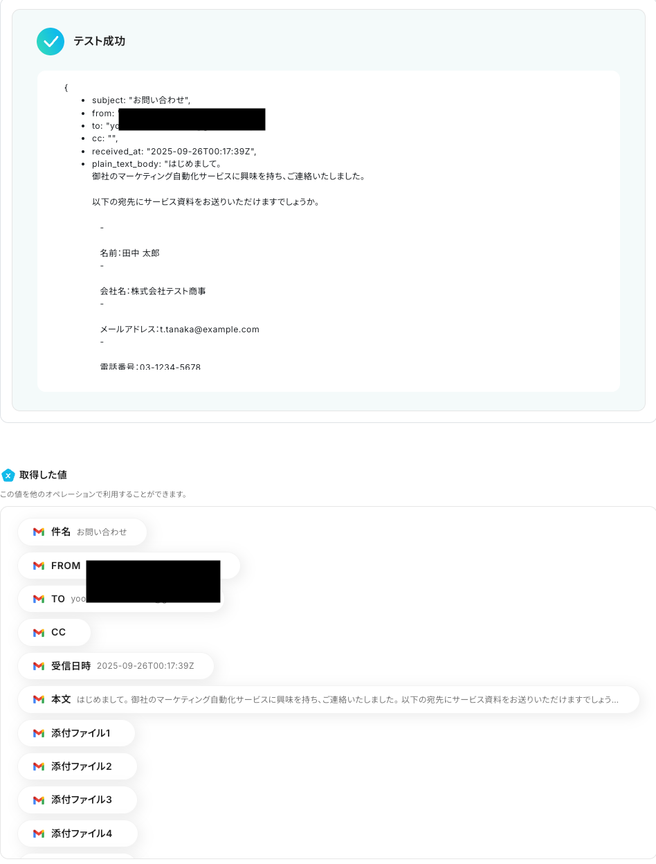 テストに成功すると、Gmailで受信した特定ラベルのメールに関する情報が一覧で表示されるはずです。