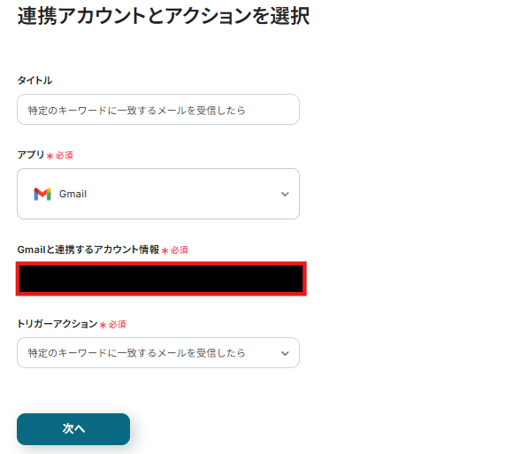 連携アカウントとアクションを選択する画面が表示されるので、今回連携するGmailのアカウントを確認し「次へ」をクリックします。