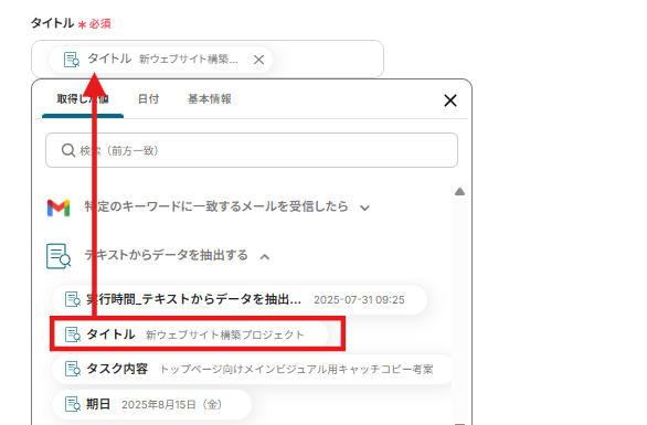 説明、期限にはタイトル同様、取得した値から「タスク内容」をクリックしましょう。