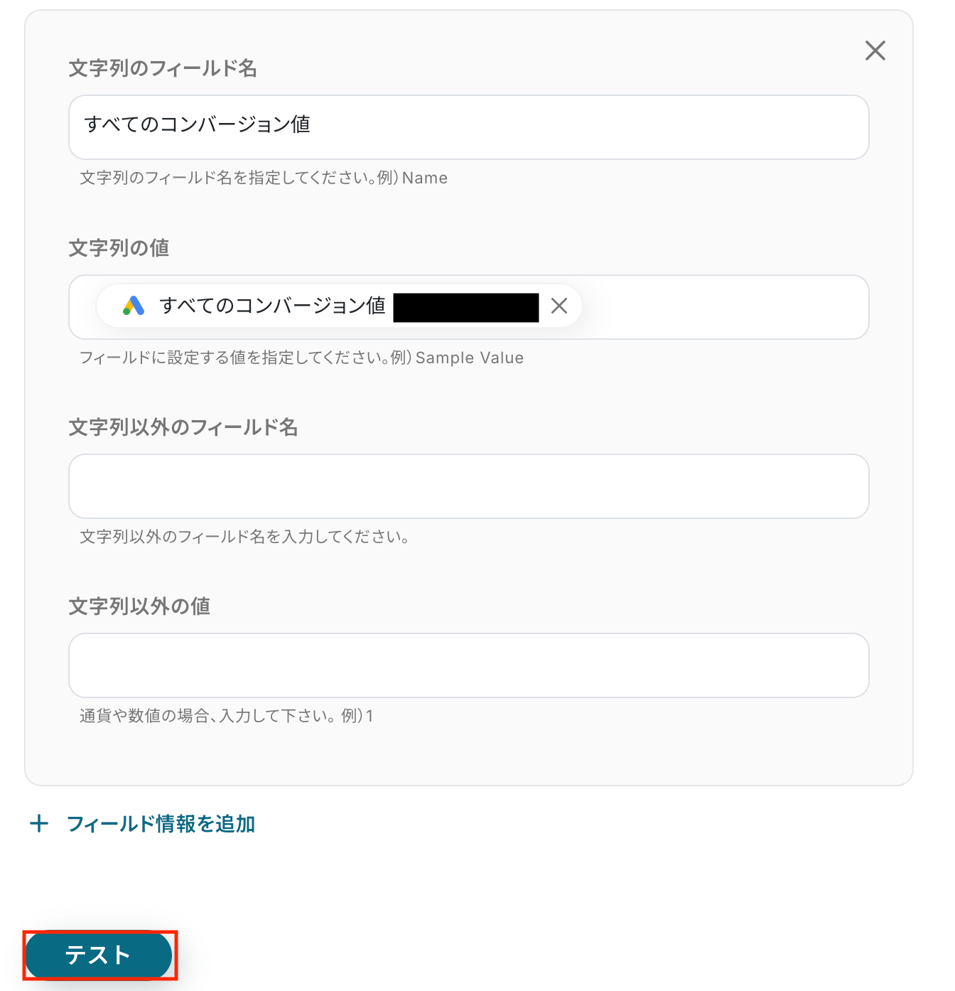 それぞれの項目について入力が完了したら、「テスト」をクリックして、設定した内容でAirtableにレコードが作成されるか確認しましょう。