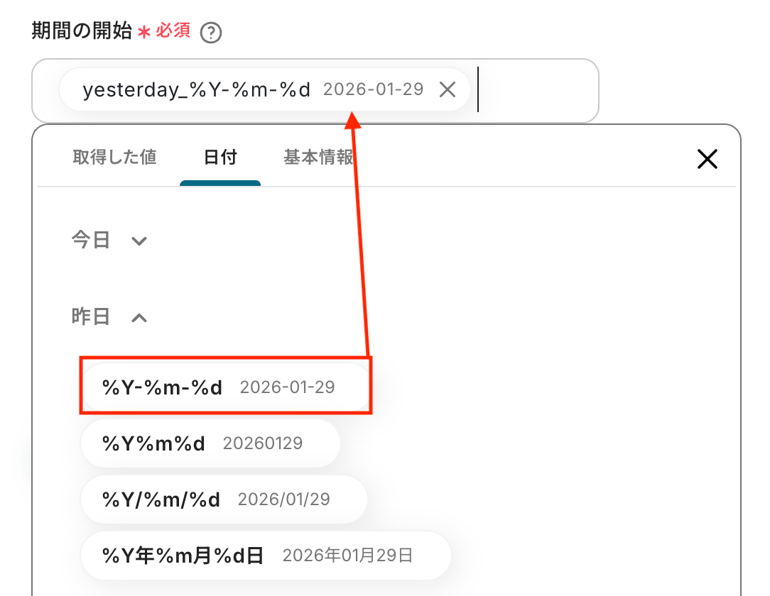 スケジュールトリガーとあわせて「日時・日付の加算減算」オペレーションを設定することで、「昨日」「先週」などの期間を自動で計算し、その結果をレポート取得条件に設定できます。
