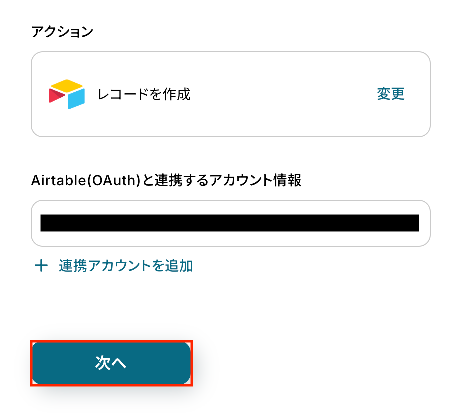 アクションはあらかじめ設定されているため、そのまま内容を確認してください。 Airtableと連携するアカウント情報に問題がなければ、「次へ」をクリックします。
