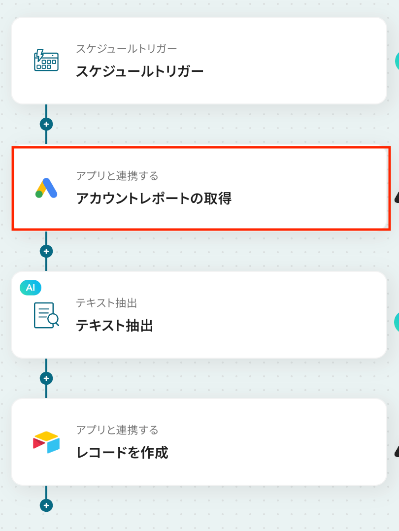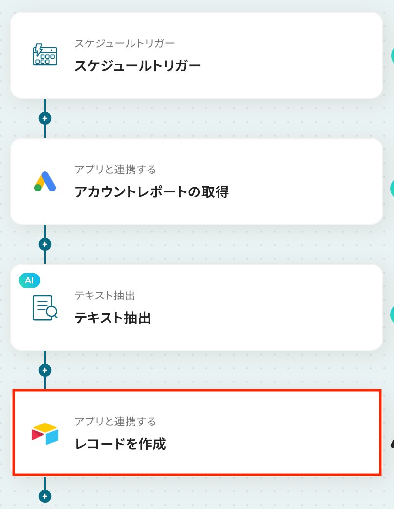 はじめに、AirtableとGoogle AdsをYoomに連携します 次に、トリガーでスケジュールトリガー機能を選択し、「スケジュールトリガー」アクションでフローを実行したい日時を設定します 次に、オペレーションでGoogle Adsを選択し、「アカウントレポートの取得」アクションを設定します 次に、オペレーションでAI機能を選択し、「テキスト抽出」アクションで取得したレポートから必要な情報を抽出します 最後に、オペレーションでAirtableを選択し、「レコードを作成」アクションで抽出したデータを指定のテーブルに追加します ※「トリガー」:フロー起動のきっかけとなるアクション、「オペレーション」:トリガー起動後、フロー内で処理を行うアクション■このワークフローのカスタムポイント
