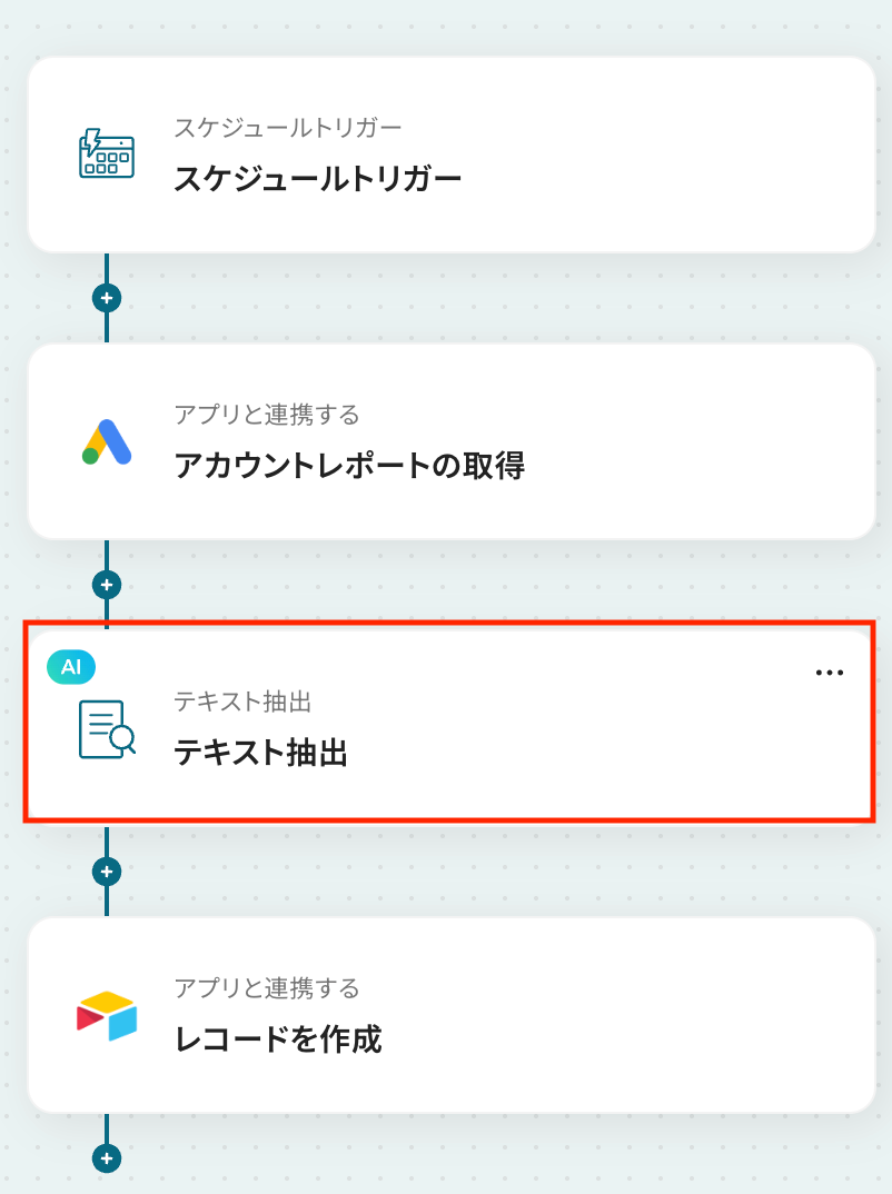ステップ5:AI機能でテキスト抽出 続いて、前のステップでGoogle Adsから取得した値を利用して、AI機能で必要な情報を抽出する設定を行いましょう。