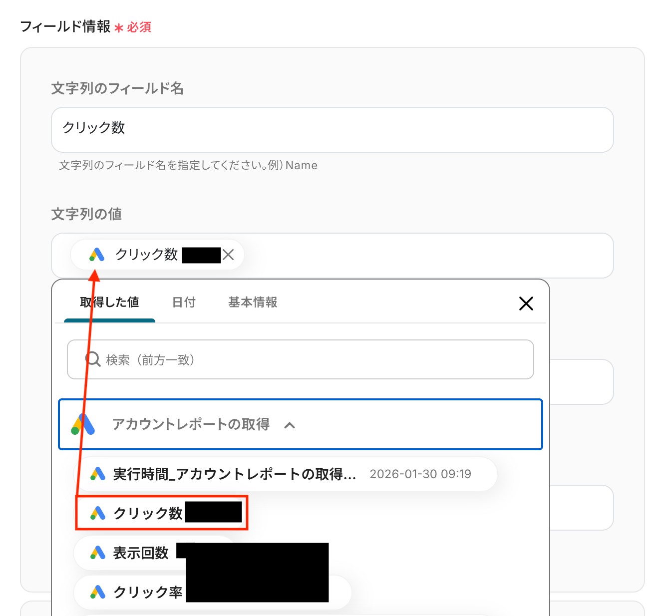 入力欄をクリックすると前のステップでGoogle Adsやテキスト抽出から取得した値が一覧で表示されるので、対応する項目に正しくマッピングしましょう。