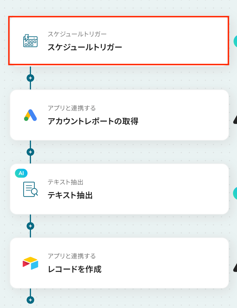 スケジュールトリガー機能では、レポートを取得したい日時(毎日、毎週など)を自由に設定してください Google Adsのアクションでは、レポートを取得する広告アカウントIDや対象期間を任意で設定できます AI機能によるテキスト抽出では、取得したレポートデータの中から、Airtableに追加したい項目を自由に指定できます Airtableのアクションでは、どのテーブルにデータを追加するかを指定し、各項目に対応する値を設定してください ■注意事項