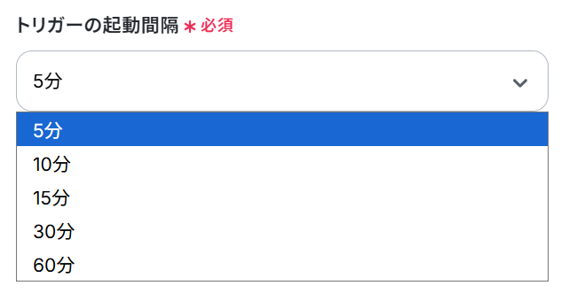 トリガーの起動タイミングは、5分、10分、15分、30分、60分のいずれかで設定できます。ご利用プラン によって、設定できるトリガーの最短間隔が違うので、その点は要チェックです。 なお、基本的にはそのプランの最短の起動間隔にしてお使いいただくことをおすすめします。