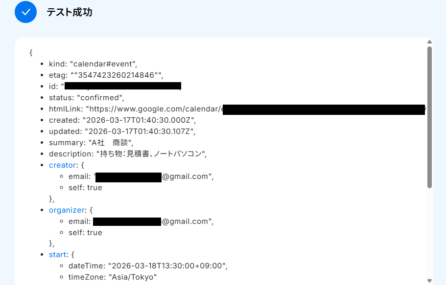 再びYoomの画面に戻り「テスト」ボタンをクリックしてください。 テストが成功すると、Googleカレンダーに作成した予定の情報が「取得した値」 に表示されます。 ここで取得した値は、次のステップで活用できます。確認できたら「完了」ボタンをクリックしましょう。 ※テストの重要性:「取得した値」のテスト値について も併せてご確認ください。