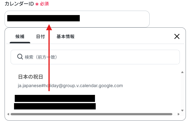 カレンダーIDは、枠内をクリックし表示される候補から選択しましょう。
