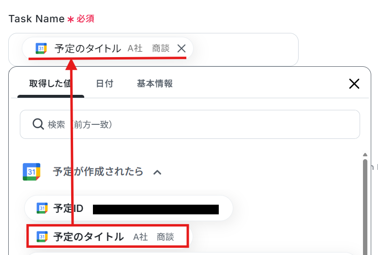Task Nameはデフォルトで設定されています。 このように設定することで、Googleカレンダーに作成した「予定のタイトル」を自動で引用可能です。※取得した値を利用することで、トリガーが起動するたびに最新の値を自動で引用できます。