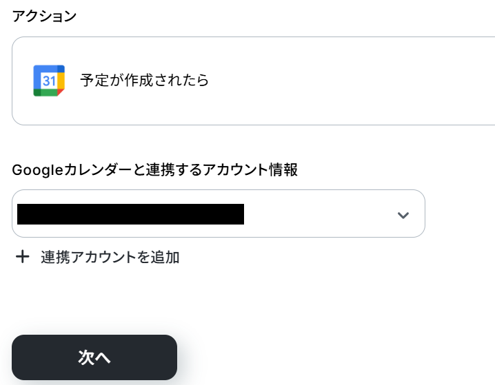 Googleカレンダーと連携するアカウント情報に誤りが無いか確認し、「次へ」ボタンをクリックしましょう。