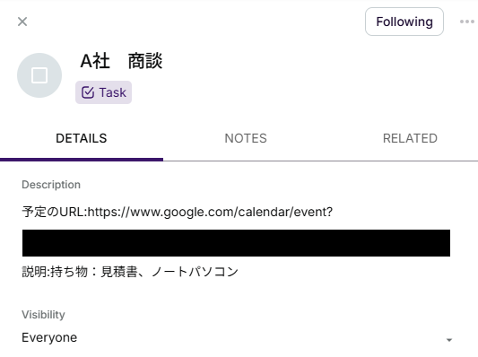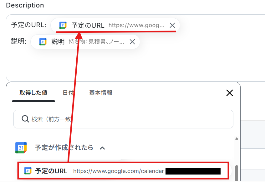 Descriptionは、Googleカレンダーに作成した「予定のURL」と「説明」を自動で引用できるように設定されています。 こちらの項目は変更可能なため、用途に合わせて文章や使用する取得した値を自由に変更し設定してみてください。
