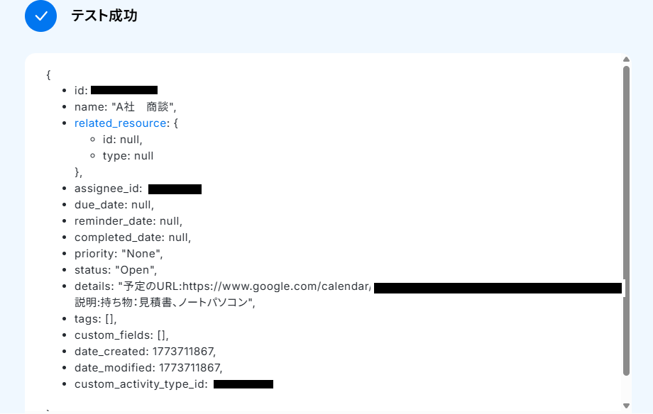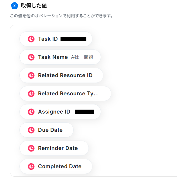 Asanaの「タスクを追加」オペレーションでは、前のステップでCopperから取得したタスク名や詳細といった情報を連携し、タスクの内容を動的に設定してください。 タスクを追加したいAsanaのプロジェクトIDおよびセクションIDには、ユーザーの管理体制に合わせて任意の値を設定してください。 ■注意事項