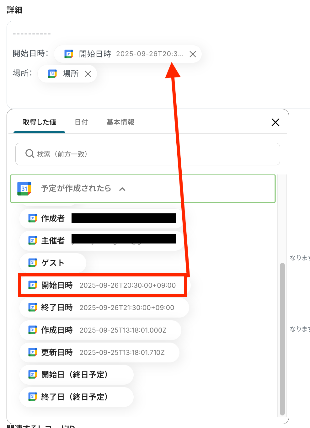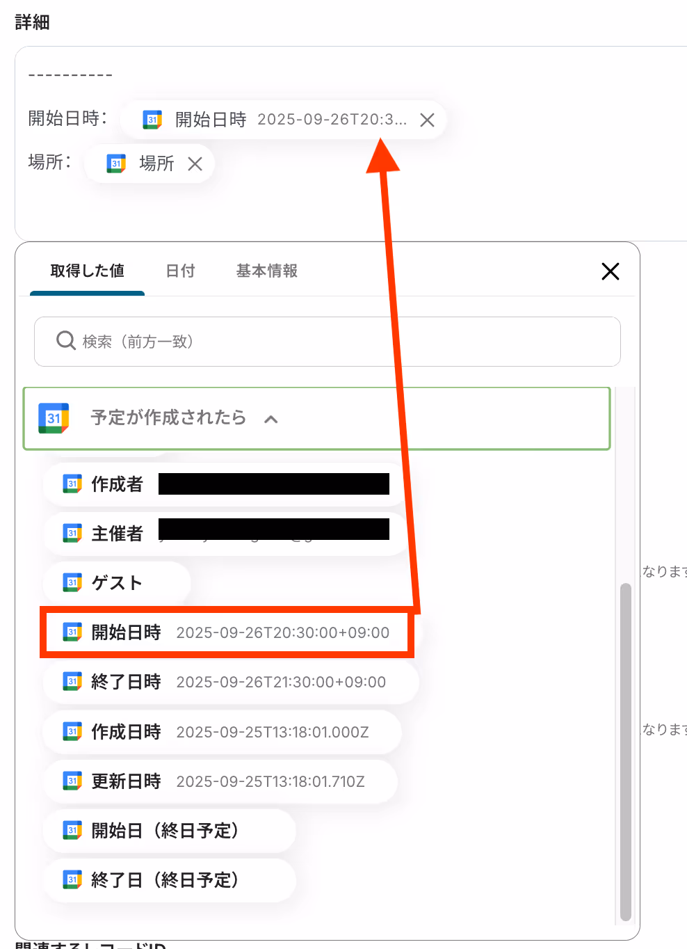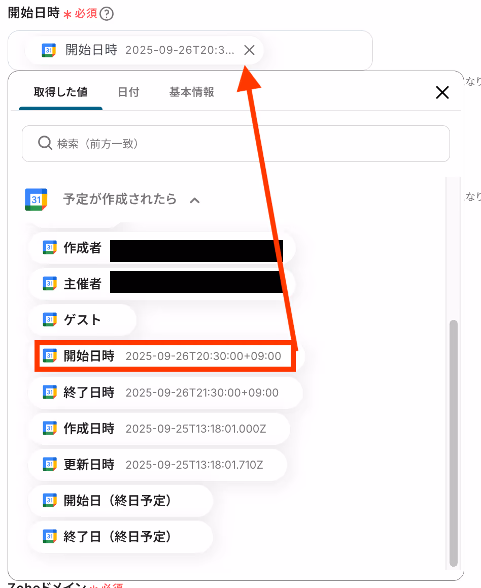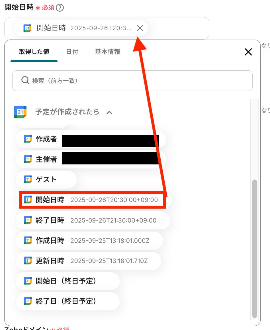 以下の画像の取得した値を利用し、Zoho CRMの予定が作成できます。