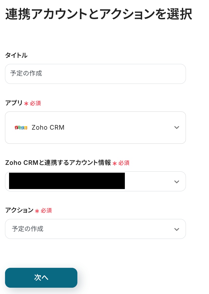 連携アカウントとアクションを選択する画面は、以下を確認後、次へをクリックしましょう。