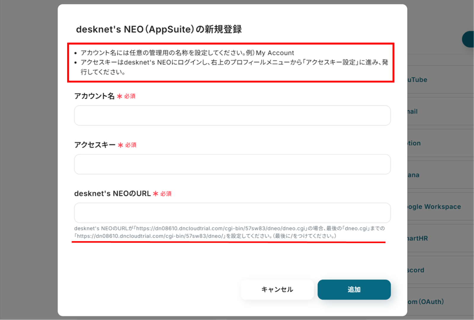 desknet's NEO(AppSuite)の新規登録画面で赤枠を確認の上、アカウント名、アクセスキー、desknet's NEOのURLを入力し「追加」をクリックすると連携完了です。