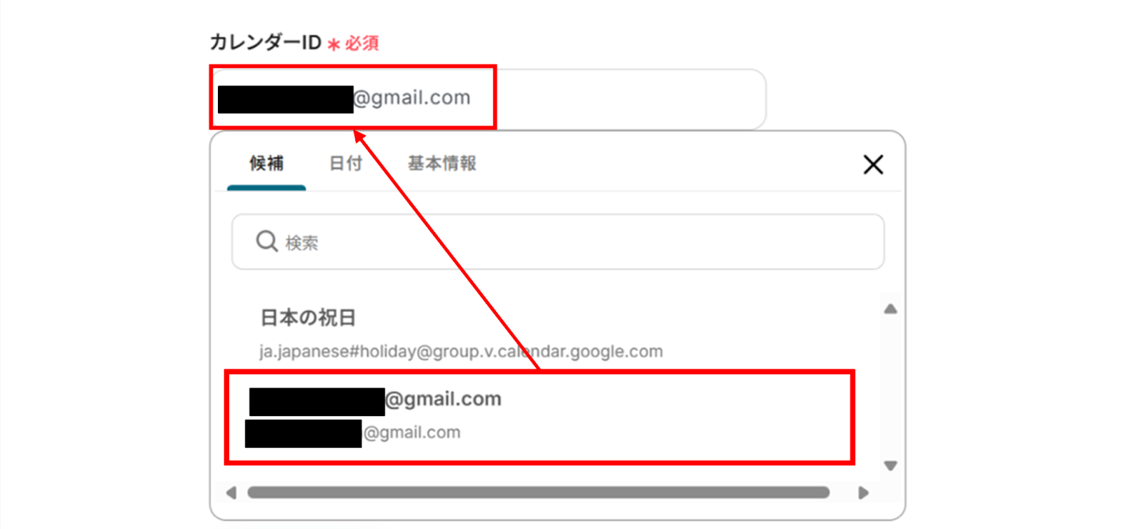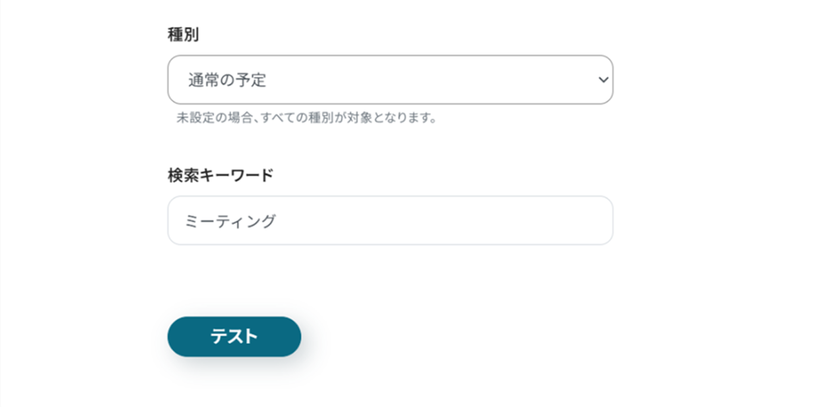 - 検索キーワード:Googleカレンダーに登録する予定で、特定のキーワードに一致するもののみを検知対象としたいときに入力してください