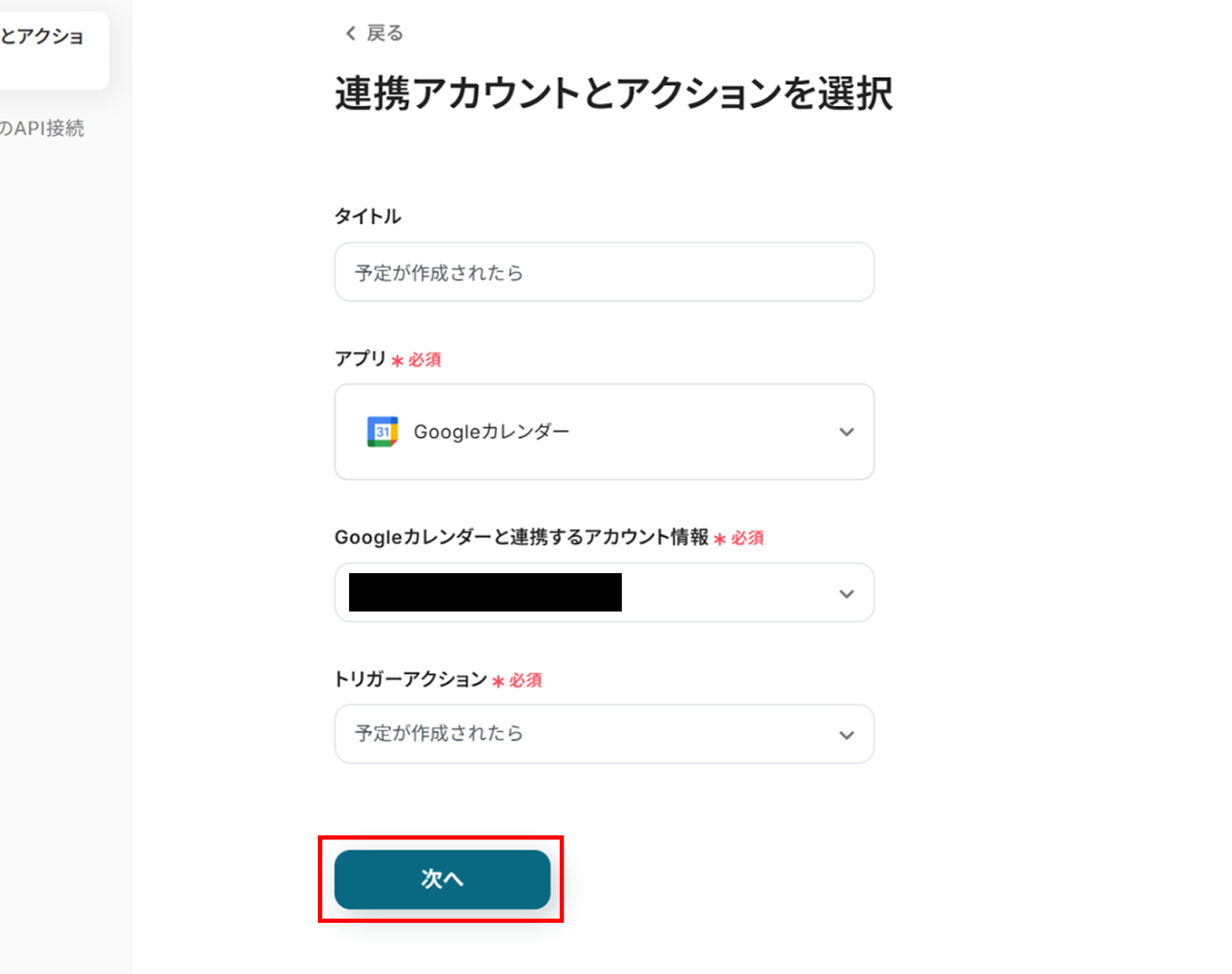 トリガーアクションは「予定が作成されたら」のままで「次へ」をクリックします。