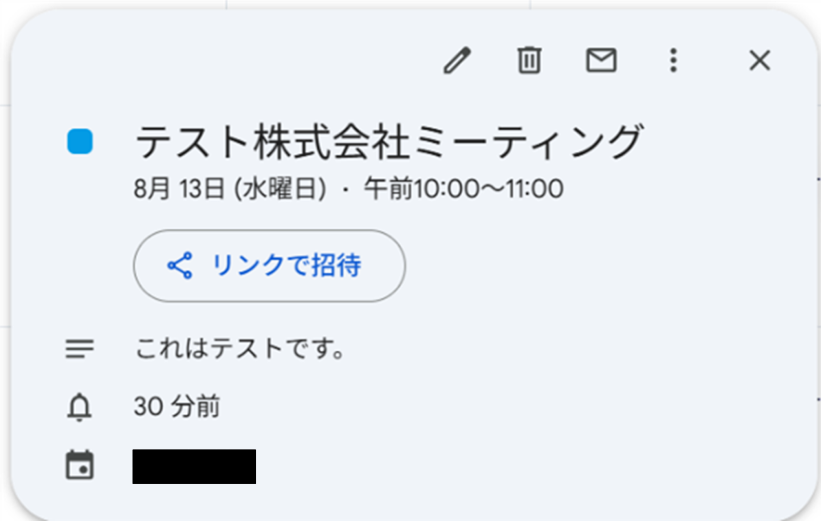 テストをクリックする前に、Googleカレンダーにテスト用のスケジュールを登録します。
