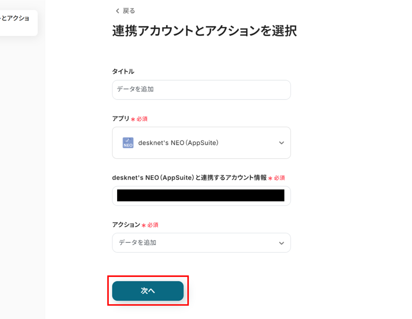 (2)「連携アカウントとアクションを選択」画面で、desknet's NEO(AppSuite)と連携するアカウント情報に誤りがないかを確認してください。