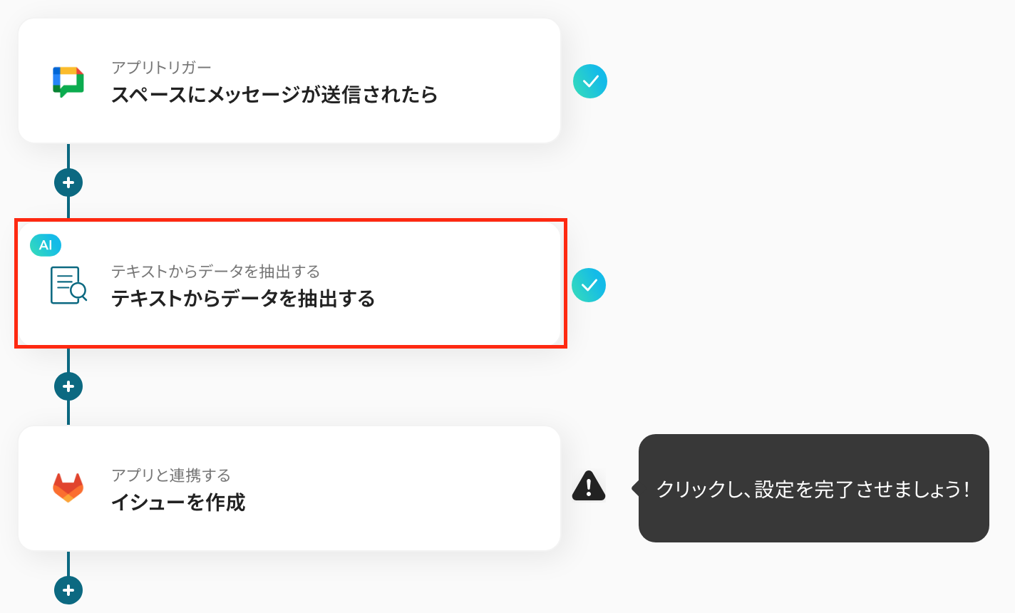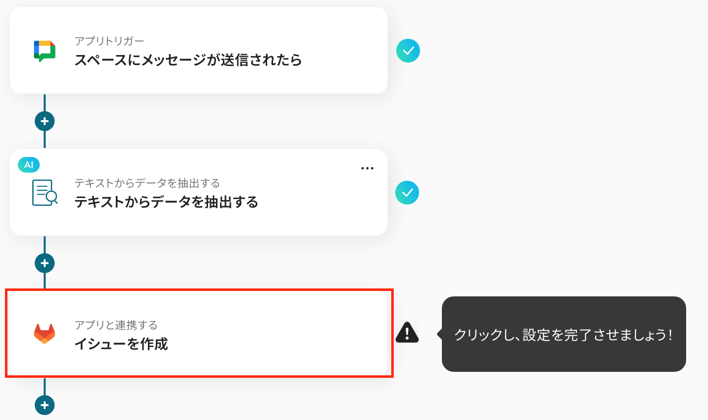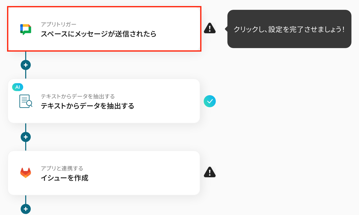 Google Chatのトリガー設定、テキストの抽出設定およびGitLabのアクション設定