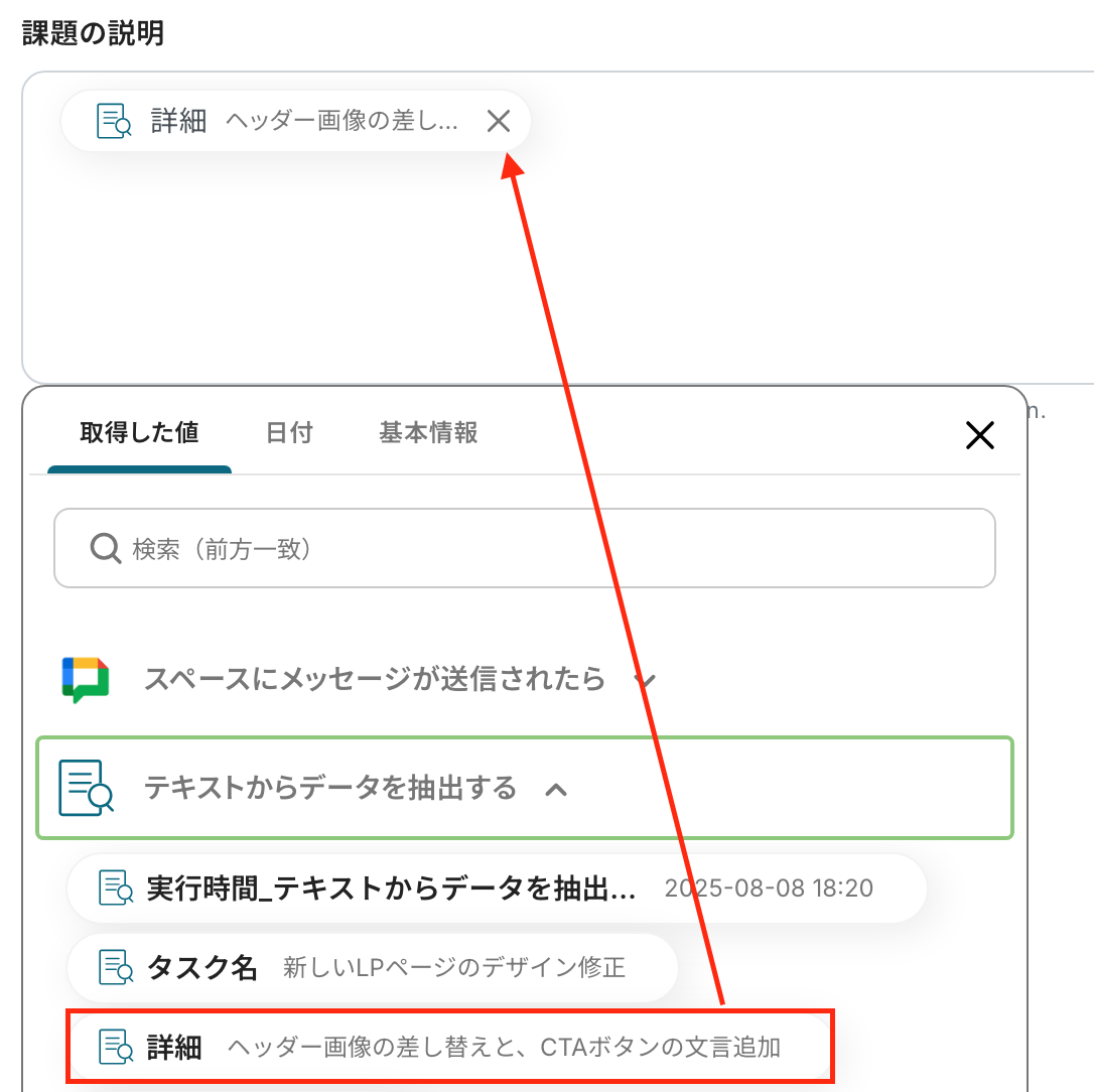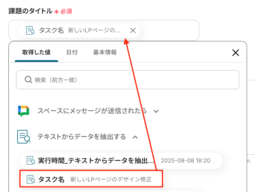 「課題のタイトル」 :入力欄をクリックして表示されるアウトプットを引用して設定します。固定値を設定する場合は、直接入力してください。