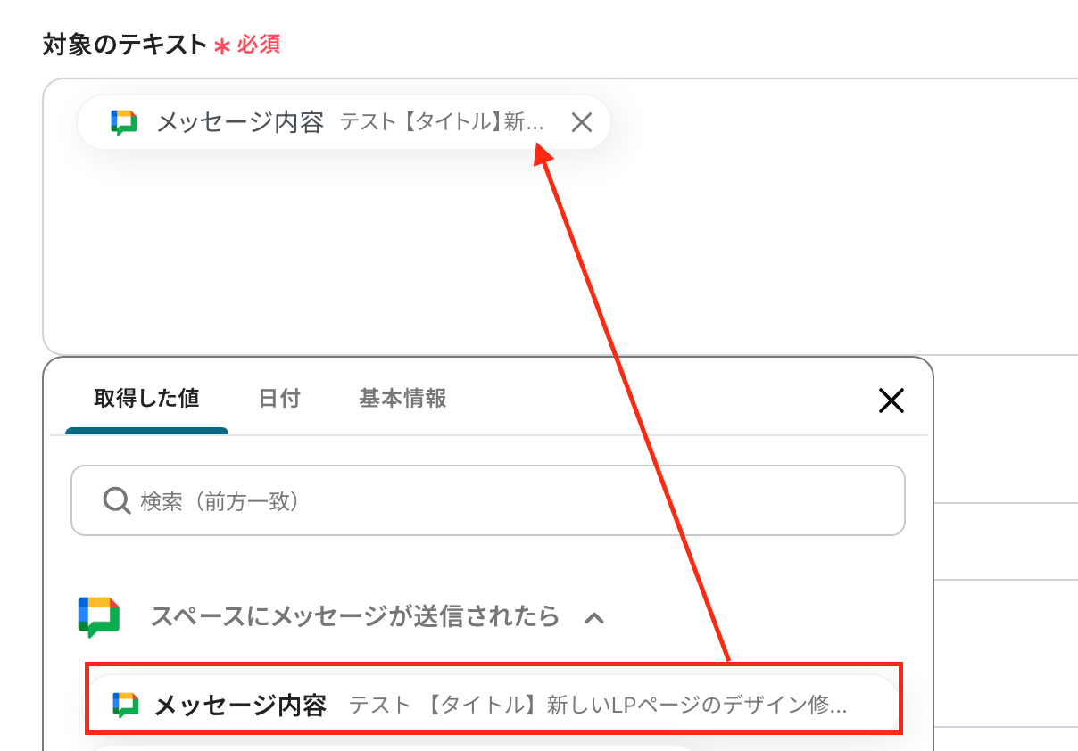 「対象のテキスト」 :データを抽出したいテキストを設定します。入力欄をクリックするとアウトプットが表示されるので、「メッセージ内容」を設定してください。